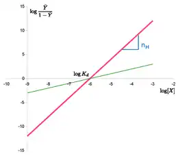 This last form of the Hill–Langmuir equation is advantageous because a plot of versus yields a linear plot, which is called a Hill plot.[7][8] Because the slope of a Hill plot is equal to the Hill coefficient for the biochemical interaction, the slope is denoted by . A slope greater than one thus indicates positively cooperative binding between the receptor and the ligand, while a slope less than one indicates negatively cooperative binding.