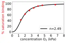 Plot of the % saturation of oxygen binding to hemaoglobin, as a function of the amount of oxygen present (expressed as an oxygen pressure). Data (red circles) and Hill equation fit (black curve) from original 1910 paper of Hill.[6]