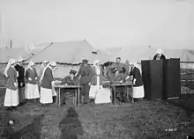 When Canadian nurses volunteered to serve during World War I, they were made commissioned officers by the Canadian Army before being sent overseas,[76] a move that would grant them some authority in the ranks, so that enlisted patients and orderlies would have to comply with their direction. Canada was the first country in the world to grant women this privilege. At the beginning of the War, nurses were not dispatched to the casualty clearing stations near the front lines, where they would be exposed to shell fire. They were initially assigned to hospitals a safe distance away from the front lines. As the war continued, however, nurses were assigned to casualty clearing stations. They were exposed to shelling, and caring for soldiers with "shell shock" and casualties suffering the effects of new weapons such as poisonous gas, as Katherine Wilson-Sammie recollects in Lights Out! A Canadian Nursing Sister’s Tale.[77] World War I was also the first war in which a clearly marked hospital ship evacuating the wounded was targeted and sunk by an enemy submarine or torpedo boat, an act that had previously been considered unthinkable, but which happened repeatedly (see List of hospital ships sunk in World War I). Nurses were among the casualties.