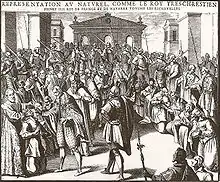 Initially, the touching ceremony was an informal process. Sickly individuals could petition the court for a royal touch and the touch would be performed at the King's earliest convenience. At times, the King of France would touch affected subjects during his royal walkabout. The rapid spread of tuberculosis across France and England, however, necessitated a more formal and efficient touching process. By the time of Louis XIV of France, placards indicating the days and times the King would be available for royal touches were posted regularly; sums of money were doled out as charitable support.[41][42] In England, the process was extremely formal and efficient. As late as 1633, the Book of Common Prayer of the Anglican Church contained a Royal Touch ceremony.[43] The monarch (king or queen), sitting upon a canopied throne, touched the affected individual, and presented that individual with a coin – usually an Angel, a gold coin the value of which varied from about 6 shillings to about 10 shillings – by pressing it against the affected's neck.[41]