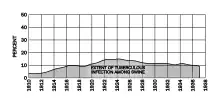 In the 19th century, TB killed about a quarter of the adult population of Europe.[65] In western continental Europe, epidemic TB may have peaked in the first half of the 19th century.[64] In addition, between 1851 and 1910, around four million died from TB in England and Wales – more than one third of those aged 15 to 34 and half of those aged 20 to 24 died from TB.[61] By the late 19th century, 70–90% of the urban populations of Europe and North America were infected with the Mycobacterium tuberculosis, and about 80% of those individuals who developed active TB died of it.[66] However, mortality rates began declining in the late 19th century throughout Europe and the United States.[66]