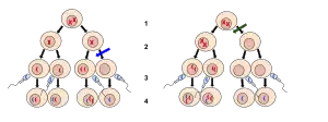 Meiosis is a round of two cell divisions that results in four haploid daughter cells that each contain half the number of chromosomes as the parent cell.[9] It reduces the chromosome number in a germ cell by half by first separating the homologous chromosomes in meiosis I and then the sister chromatids in meiosis II. The process of meiosis I is generally longer than meiosis II because it takes more time for the chromatin to replicate and for the homologous chromosomes to be properly oriented and segregated by the processes of pairing and synapsis in meiosis I.[6] During meiosis, genetic recombination (by random segregation) and crossing over produces daughter cells that each contain different combinations of maternally and paternally coded genes.[9] This recombination of genes allows for the introduction of new allele pairings and genetic variation.[2] Genetic variation among organisms helps make a population more stable by providing a wider range of genetic traits for natural selection to act on.[2]