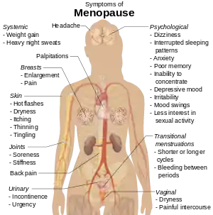 HRT is often given as a short-term relief from menopausal symptoms during perimenopause.[19] Potential menopausal symptoms include:[1][2]