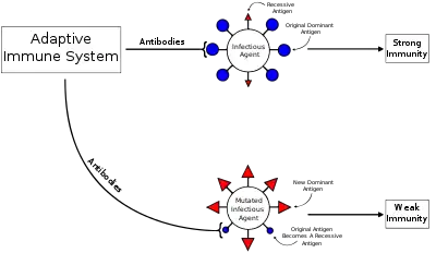The original antigenic sin: When the body first encounters an infection it produces effective antibodies against its dominant antigens and thus eliminates the infection. But when it encounters the same infection, at a later evolved stage, with a new dominant antigen, with the original antigen now being recessive, the immune system will still produce the former antibodies against this old "now recessive antigen" and not develop new antibodies against the new dominant one. This results in the production of ineffective antibodies and thus a weak immunity.