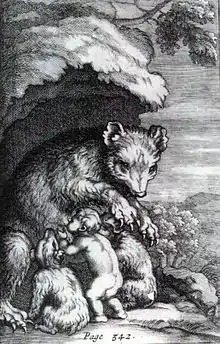 The suckling of infants by animals was a repeated theme in classical mythology. Most famously, twin brothers Romulus and Remus (the former founded Rome) were portrayed as having been raised by a she-wolf which suckled the infants, as depicted in the iconic image of the Capitoline Wolf. The Greek god Zeus was said to have been brought up by Amalthea, portrayed variously as a goat who suckled the god or as a nymph who brought him up on the milk of her goat. Similarly, Telephus, the son of the demigod Heracles, was suckled by a deer.[4] Several famous ancient historical figures were claimed to have been suckled by animals; Cyrus I of Persia was said to have been suckled by a dog, while mares supposedly suckled Croesus, Xerxes and Lysimachus. In reality, though, such stories probably owed more to myth-making about such prominent figures, as they were used as evidence of their future greatness.[5]