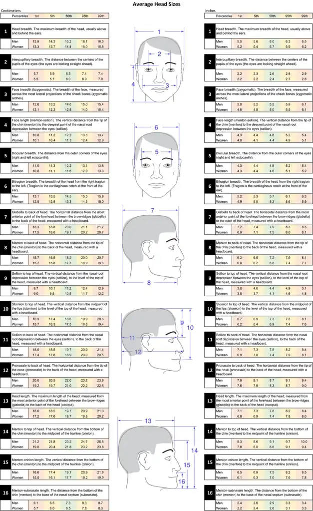 Some values in the table below may not be correct. In particular, a random biocular breadth measurement showed a value of 101.6 mm for an average adult male. The first percentile value below is 110 mm for an adult male. Another user has also indicate around 100 mm being an average value for biocular breadth. Therefore, the biocular breadth values appear to be increased by around 22 mm.