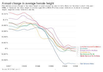 Annual change in average female height by year of birth