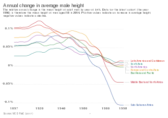 In general, there were no significant differences in regional height levels throughout the nineteenth century.[67] The only exceptions of this rather uniform height distribution were people in the Anglo-Saxon settlement regions who were taller than the average and people from Southeast Asia with below-average heights. However, at the end of the nineteenth century and in the middle of the first globalization period, heights between rich and poor countries began to diverge.[68] These differences did not disappear in the deglobalization period of the two World wars. Baten and Blum (2014) [69] find that in the nineteenth century, important determinants of height were the local availability of cattle, meat and milk as well as the local disease environment. In the late twentieth century, however, technologies and trade became more important, decreasing the impact of local availability of agricultural products.