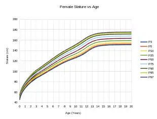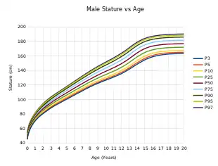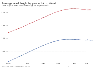 The study of height is known as auxology.[12] Growth has long been recognized as a measure of the health of individuals, hence part of the reasoning for the use of growth charts. For individuals, as indicators of health problems, growth trends are tracked for significant deviations, and growth is also monitored for significant deficiency from genetic expectations. Genetics is a major factor in determining the height of individuals, though it is far less influential regarding differences among populations. Average height is relevant to the measurement of the health and wellness (standard of living and quality of life) of populations.[13]