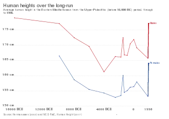 Average human height in the Eastern Mediterranean from the Upper Paleolithic (before 16,000 BC) period, through to 1996.