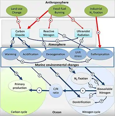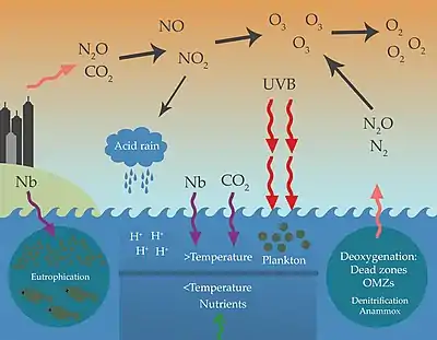 The diagram on the right shows some human impacts on the marine nitrogen cycle. Bioavailable nitrogen (Nb) is introduced into marine ecosystems by runoff or atmospheric deposition, causing eutrophication, the formation of dead zones and the expansion of the oxygen minimum zones (OMZs). The release of nitrogen oxides (N2O, NO) from anthropogenic activities and oxygen-depleted zones causes stratospheric ozone depletion leading to higher UVB exposition, which produces the damage of marine life, acid rain and ocean warming. Ocean warming causes water stratification, deoxygenation, and the formation of dead zones. Dead zones and OMZs are hotspots for anammox and denitrification, causing nitrogen loss (N2 and N2O). Elevated atmospheric carbon dioxide acidifies seawater, decreasing pH-dependent N-cycling processes such as nitrification, and enhancing N2 fixation.[106]