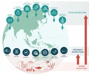 Changes in marine ecosystem dynamics are influenced by socioeconomic activities (for example, fishing, pollution) and human-induced biophysical change (for example, temperature, ocean acidification) and can interact and severely impact marine ecosystem dynamics and the ecosystem services they generate to society. Understanding these direct—or proximate—interactions is an important step towards sustainable use of marine ecosystems. However, proximate interactions are embedded in a much broader socioeconomic context where, for example, economy through trade and finance, human migration and technological advances, operate and interact at a global scale, influencing proximate relationships.[146]