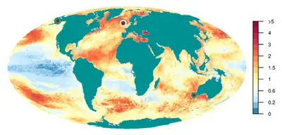 The ocean can be described as the world's largest ecosystem and it's home for many species of marine life. Different activities carried out and caused by human beings such as global warming, ocean acidification, and pollution affect marine life and its habitats. For the past 50 years, more than 90 percent of global warming resulting from human activity has been absorbed into the ocean. This results in the rise of ocean temperatures and ocean acidification which is harmful to many fish species and causes damage to habitats such as coral.[4] With coral producing materials such as carbonate rock and calcareous sediment, this creates a very unique and valuable ecosystem not only providing food/homes for marine creatures but also having many benefits for humans too. Ocean acidification caused by rising levels of carbon dioxide leads to coral bleaching where the rates of calcification is lowered affecting coral growth.[5] Additionally, another issue caused by humans which impacts marine life is marine plastic pollution, which poses a threat to marine life.[6] According to the IPCC (2019), since 1950 "many marine species across various groups have undergone shifts in geographical range and seasonal activities in response to ocean warming, sea ice change and biogeochemical changes, such as oxygen loss, to their habitats."[7]