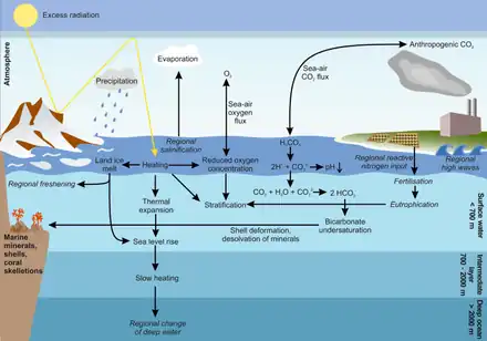 While the full implications of elevated CO2 on marine ecosystems are still being documented, there is a substantial body of research showing that a combination of ocean acidification and elevated ocean temperature, driven mainly by CO2 and other greenhouse gas emissions, have a compounded effect on marine life and the ocean environment. This effect far exceeds the individual harmful impact of either.[135][138][137] In addition, ocean warming exacerbates ocean deoxygenation, which is an additional stressor on marine organisms, by increasing ocean stratification, through density and solubility effects, thus limiting nutrients,[139][140] while at the same time increasing metabolic demand.