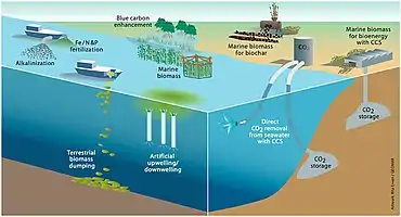 As the technical and political challenges of land-based carbon dioxide removal approaches become more apparent, the oceans may be the new "blue" frontier for carbon drawdown strategies in climate governance.[128] Marine environments are the blue frontier of a strategy for novel carbon sinks in post-Paris climate governance, from nature-based ecosystem management to industrial-scale technological interventions in the Earth system. Marine carbon dioxide removal approaches are diverse [129][130] — although several resemble key terrestrial carbon dioxide removal proposals.[128] Ocean alkalinisation (adding silicate mineral such as olivine to coastal seawater, to increase CO2 uptake through chemical reactions) is enhanced weathering, blue carbon (enhancing natural biological CO2 drawdown from coastal vegetation) is marine reforestation, and cultivation of marine biomass (i.e., seaweed) for coupling with consequent carbon capture and storage is the marine variant of bioenergy and carbon capture and storage. Wetlands, coasts, and the open ocean are being conceived of and developed as managed carbon removal-and-storage sites, with practices expanded from the use of soils and forests.[128]