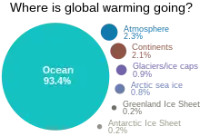 Most heat energy from global warming goes into the ocean, and not into the atmosphere or warming up the land.[49][50] Scientists realized over 30 years ago the ocean was a key fingerprint of human impact on climate change and "the best opportunity for major improvement in our understanding of climate sensitivity is probably monitoring of internal ocean temperature".[51]