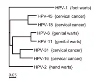 HPV is a group of more than 200 related viruses, which are designated by a number for each virus type.[9] Some HPV types, such as HPV5, may establish infections that persist for the lifetime of the individual without ever manifesting any clinical symptoms. HPV types 1 and 2 can cause common warts in some infected individuals.[17] HPV types 6 and 11 can cause genital warts and laryngeal papillomatosis.[1]