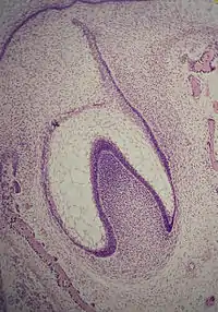 The enamel organ is composed of the outer enamel epithelium, inner enamel epithelium, stellate reticulum and stratum intermedium.[2] These cells give rise to ameloblasts, which produce enamel and become a part of the reduced enamel epithelium (REE) after maturation of the enamel. The location where the outer enamel epithelium and inner enamel epithelium join is called the cervical loop.[1] The growth of cervical loop cells into the deeper tissues forms Hertwig Epithelial Root Sheath, which determines the root shape of the tooth. During tooth development there are strong similarities between keratinization and amelogenesis.[5][6] Keratin is also present in epithelial cells of tooth germ [7] and a thin film of keratin is present on a recently erupted tooth (Nasmyth's membrane or enamel cuticle).[8]