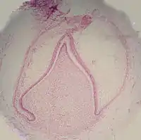 The tooth germ is an aggregation of cells that eventually forms a tooth.[2] These cells are derived from the ectoderm of the first pharyngeal arch and the ectomesenchyme of the neural crest.[1][3][4] The tooth germ is organized into three parts: the enamel organ, the dental papilla and the dental sac or follicle.