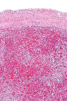 Micrograph of hyaloserositis of the spleen (sugar-coated spleen). H&E stain.
