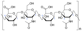 Hyaluronic acid is a polymer of disaccharides, which are composed of D-glucuronic acid and N-acetyl-D-glucosamine, linked via alternating β-(1→4) and β-(1→3) glycosidic bonds. Hyaluronic acid can be 25,000 disaccharide repeats in length. Polymers of hyaluronic acid can range in size from 5,000 to 20,000,000 Da in vivo. The average molecular weight in human synovial fluid is 3–4 million Da, and hyaluronic acid purified from human umbilical cord is 3,140,000 Da;[5] other sources mention average molecular weight of 7 million Da for synovial fluid.[4] Hyaluronic acid also contains silicon, ranging 350–1,900 μg/g depending on location in the organism.[37]