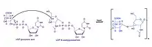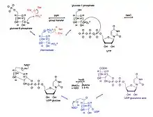 UDP-glucuronic acid is formed from hasC (UDP-glucose pyrophosphorylase) converting glucose-1-P into UDP-glucose, which then reacts with hasB (UDP-glucose dehydrogenase) to form UDP-glucuronic acid.[46]