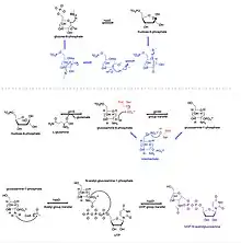 HA consists of repeating β4-glucuronic acid (GlcUA)-β3-N-acetylglucosamine (GlcNAc) disaccharides, and is synthesized by hyaluronan synthases (HAS), a class of integral membrane proteins that produce the well-defined, uniform chain lengths characteristic to HA.[46] There are three existing types of HASs in vertebrates: HAS1, HAS2, HAS3; each of these contribute to elongation of the HA polymer.[8] For an HA capsule to be created, this enzyme must be present because it polymerizes UDP-sugar precursors into HA. HA precursors are synthesized by first phosphorylating glucose by hexokinase, yielding glucose-6-phosphate, which is the main HA precursor.[47] Then, two routes are taken to synthesize UDP-n-acetylglucosamine and UDP-glucuronic acid which both react to form HA. Glucose-6-phosphate gets converted to either fructose-6-phosphate with hasE (phosphoglucoisomerase), or glucose-1-phosphate using pgm (α -phosphoglucomutase), where those both undergo different sets of reactions.[47]