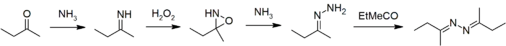 2 (CH3)2CO + N2H4 → 2 H2O + ((CH3)2C=N)2