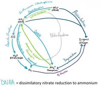 The study of the Nitrogen Cycle in hydrothermal vent microbial communities still requires more comprehensive research.[24] However, isotope data suggests that microorganism influence dissolved inorganic nitrogen quantities and compositions and all pathways of the nitrogen cycle are likely to be found at hydrothermal vents.[25] Biological nitrogen fixation is important to provide some of the biologically available nitrogen to the nitrogen cycle especially at unsedimented hydrothermal vents.[24] Nitrogen fixation is done by many different microbes including methanogen in the orders Methanomicrobiales, Methanococcales, and Methanobacteriales.[24] Thermophilic microbes have been found to be able to fix nitrogen at higher temperatures such as 92 °C.[24] Nitrogen fixation may be especially prevalent in microbial mats and particulate material where biologically available levels of nitrogen are low, due to high microbe density and anaerobic environment allows the function of nitrogenase, a nitrogen fixing enzyme.[24] Evidence have also been detected of assimilation, nitrification, denitrification, anamox, mineralization and dissimilatory nitrate reduction to ammonium.[25] For example, sulfur oxidizing bacteria like Begiatoa species, perform denitrification and reduces nitrate to oxidize H2S.[24] Nitrate assimilation is done by symbiotic species of Riftia pachyptila tubeworm[24]