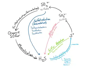 Sulfur reduction uses sulfate as an electron acceptor for the assimilation of sulfur. Microbes that perform sulfate reduction typically use hydrogen, methane or organic matter as an electron donor.[18][23] Anaerobic oxidation of methane (AOM) often use sulfate as electron acceptor.[18] This method is favoured by organisms living in highly anoxic areas of the hydrothermal vent,[23] thus are one of the predominant processes that occur within the sediments.[14] Species that reduce sulfate have been identified in Archaea and members of Deltaproteobacteria such as Desulfovibrio, Desulfobulbus, Desulfobacteria, and Desulfuromonas at hydrothermal vents.[23]