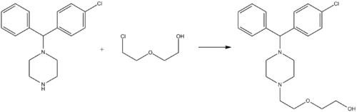 Hydroxyzine is synthesized by the alkylation of 1-(4-chlorobenzhydryl)piperazine with 2-(2-chloroethoxy)ethanol:[65]