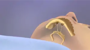 ![]() Hyo-mandibular suspension: Hyoid advanced with ghost image of original hyoid position. Shown using Encore hyoid system by Siesta Medical. |