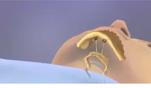 In hyo-mandibular suspension, sutures are looped around the anterior section of the hyoid bone, the hyoid is advanced typically 2–3 centimeters (until the muscle attachments to the hyoid are tensioned) using the sutures, and the hyoid advancement is locked into place and secured via bone anchors on the front lower inside portion of the jaw. This procedure is typically performed with two incisions, one incision under the chin for placement of bone anchors into the jaw and one incision directly over the hyoid bone for the most direct access to the bone. Some surgeons perform the procedure from only the single incision below the chin. Potential complications and side effects from the procedure include neck seromas, edema, and surgical site infection.