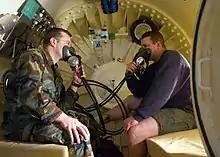 Originally therapeutic recompression was done using air as the only breathing gas, and this is reflected in several of the tables detailed below. However, work by Yarbrough and Behnke[7] showed that use of oxygen as a treatment gas is usually beneficial and this has become the standard of care for treatment of DCS.[3] Pure oxygen can be used at pressures up to 60 fsw (18 msw)[6] with acceptable risk of CNS oxygen toxicity, which generally has acceptable consequences in the chamber environment when an inside tender is at hand. At greater pressures, treatment gas mixtures using Nitrogen or Helium as a diluent to limit partial pressure of oxygen to 3 ata (3 bar) or less are preferred to air as they are more effective both at elimination of inert gases and oxygenating injured tissues in comparison with air. Nitrox and Heliox mixtures are recommended by the US Navy for treatment gases at pressures exceeding 60 fsw (18 msw), and Heliox is preferred at pressures exceeding 165 fsw (50 msw) to reduce nitrogen narcosis.[6] High oxygen fraction gas mixtures may also be substituted for pure oxygen at pressures less than 60 fsw if the patient does not tolerate 100% oxygen.[6]
