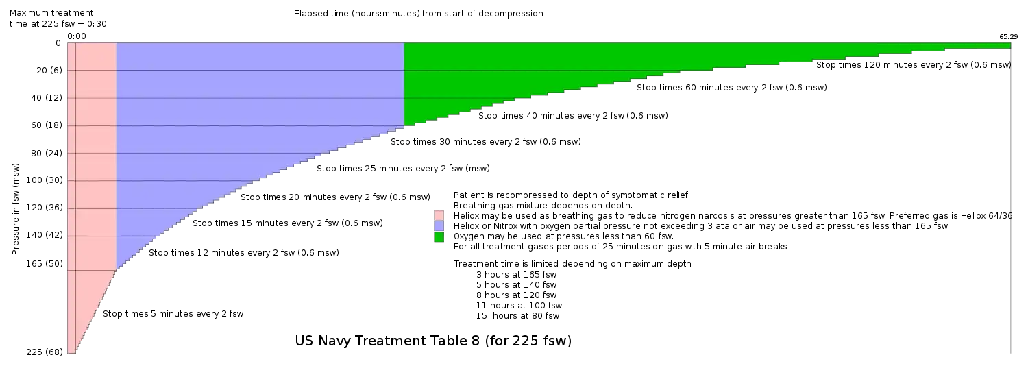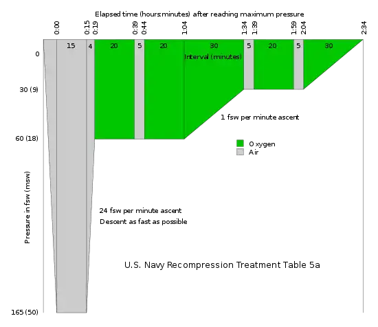 Use: Treatment of mild decompression sickness where relief occurs within 30 minutes at 30 msw (98 fsw)[26]