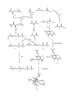Hyperforin is a polyprenylated acylphloroglucinol (PPAP) derivative with a pholoroisobutyrophenone bicyclic core. Isobutryl-CoA (17) has been determined to be one of the initial primary metabolite starter molecules in the biosynthesis of the hyperforin core structure. Isobutryl-CoA is derived from an a-ketoisovalerate intermediate (15). The bicyclic structure suggests that it has elements of meroterpenoid origin. The nucleus of hyperforin is formed in a sequence condensation of one molecule of isobutyryl-CoA and three molecules of malonyl-CoA, both catalyzed by Isobutyrophenone synthase. Type III PKS enzymes will catalyze the decarboxylative condensation of enzyme active sites to generate scaffolding.