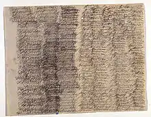 There are many accounts of patients writing in nonsensical patterns including writing in a center-seeking spiral starting around the edges of a piece of paper.[5] In one case study, a patient even wrote backward, so that the writing could only be interpreted with the aid of a mirror.[2] Sometimes the writing can consist of scribbles and frantic, random thoughts that are quickly jotted down on paper very frequently. Grammar can be present, but the meaning of these thoughts is generally hard to grasp and the sentences are loose.[5] In some cases, patients write extremely detailed accounts of events that are occurring or descriptions of where they are.[5]