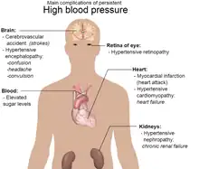 Hypertension is a condition characterized by an elevated blood pressure in which the long term consequences include cardiovascular disease, kidney disease, adrenal gland tumors, vision impairment, memory loss, metabolic syndrome, stroke and dementia.[1] It affects nearly 1 in 2 Americans and remains as a contributing cause of death in the United States.[2] There are many genetic and environmental factors involved with the development of hypertension including genetics, diet, and stress.