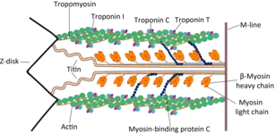 27. Cheng Y, Regnier M (July 2016). "Cardiac troponin structure-function and the influence of hypertrophic cardiomyopathy associated mutations on modulation of contractility". Archives of Biochemistry and Biophysics. 601: 11–21. doi:10.1016/j.abb.2016.02.004. PMC 4899195. PMID 26851561.