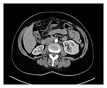 Preoperative contrasted CT scans of the patient, showing multiple bilateral kidney tumors, with diameters ranging between 1 and 5 cm. Radiologically, most of the tumors have malignant characteristics due to their hypervascularity and radiopaque enhancement.