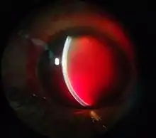 Hyphema is the medical condition of bleeding in the front (anterior) chamber of the eye between the iris and the cornea.[1] People usually first notice a loss or decrease in vision.[1] The eye may also appear to have a reddish tinge, or it may appear as a small pool of blood at the bottom of the iris in the cornea. A traumatic hyphema is caused by a blow to the eye.[1] A hyphema can also occur spontaneously.[2]