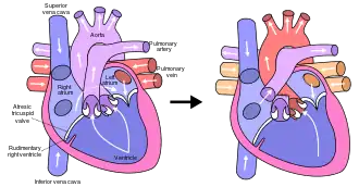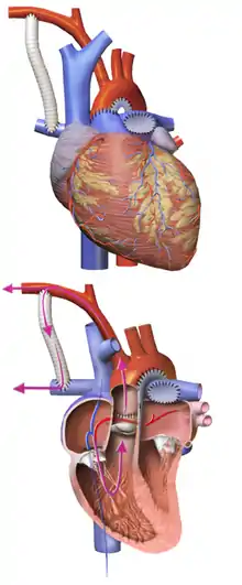 The final procedure, the Fontan procedure, completes the repair of the hypoplastic left heart.[32] Although there are several variations, the functional effect is to redirect venous blood from the lower body (through the inferior vena cava) away from the right atrium to the pulmonary artery. This should eliminate any mixing of oxygenated and deoxygenated blood in the right ventricle. The right ventricle performs the traditional job of the left, supplying the body with oxygenated blood, while the passive systemic venous pressure performs the traditional job of the right, passing deoxygenated blood to the lungs.[32]