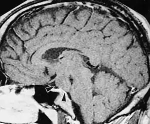 | A hypothalamic hamartoma (black arrows) on MRI | |