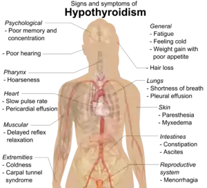 Hypothyroidism (also called underactive thyroid, low thyroid or hypothyreosis) is a disorder of the endocrine system in which the thyroid gland does not produce enough thyroid hormone.[3] It can cause a number of symptoms, such as poor ability to tolerate cold, a feeling of tiredness, constipation, slow heart rate, depression, and weight gain.[3] Occasionally there may be swelling of the front part of the neck due to goitre.[3] Untreated cases of hypothyroidism during pregnancy can lead to delays in growth and intellectual development in the baby or congenital iodine deficiency syndrome.[5]