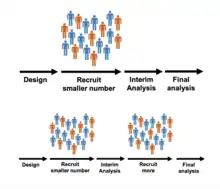 In an adaptive design of a clinical trial, the parameters and conduct of the trial for a candidate drug or vaccine may be changed based on an interim analysis.[1][2][3] Adaptive design typically involves advanced statistics to interpret a clinical trial endpoint.[2] This is in contrast to traditional single-arm (i.e. non-randomized) clinical trials or randomized clinical trials (RCTs) that are static in their protocol and do not modify any parameters until the trial is completed. The adaptation process takes place at certain points in the trial, prescribed in the trial protocol. Importantly, this trial protocol is set before the trial begins with the adaptation schedule and processes specified. Adaptions may include modifications to: dosage, sample size, drug undergoing trial, patient selection criteria and/or "cocktail" mix.[4] The PANDA (A Practical Adaptive & Novel Designs and Analysis toolkit) provides not only a summary of different adaptive designs, but also comprehensive information on adaptive design planning, conduct, analysis and reporting.[5]