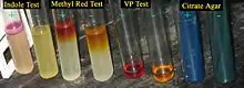 The term "IMViC" is an acronym for each of these tests. "I" is for indole test; "M" is for methyl red test; "V" is for Voges-Proskauer test, and "C" is for citrate test. The lower case "i" is merely for "in" as the Citrate test requires coliform samples to be placed "in Citrate".