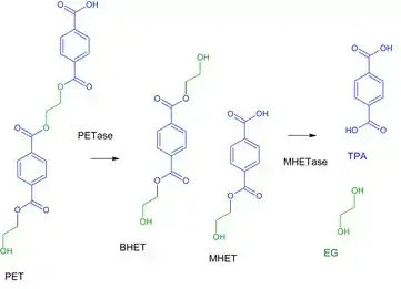 Ideonella sakaiensis adhere to PET surface and use a secreted PET hydrolase, or PETase, to degrade the PET into mono(2-hydroxyethyl)terephthalic acid (MHET), a heterodimer composed of terephthalic acid (TPA) and ethylene glycol. The PETase also degrades PET into another intermediate known as Bis-(2-hydroxyethyl) terephthalate (BHET), BHET can be converted into MHET after PET hydrolysis.[4] The I. sakaiensis PETase functions by hydrolyzing the ester bonds present in PET with high specificity. The resulting MHET is then degraded into its two monomeric constituents by a lipid-anchored MHET hydrolase enzyme, or MHETase, on the cell's outer membrane.[2] The overall mechanism of the PET plastic being broken down is exhibited in the image to the right. The monomeric constituents such as ethylene glycol is then taken up and used by I. sakaiensis and many other bacteria.[2][5] The other constituent; terephthalic acid, a more recalcitrant compound, is imported into the I. sakaiensis cell via the terephthalic acid transporter protein. Once in the cell, the aromatic terephthalic acid molecule is oxidized by terephthalic acid-1,2-dioxygenase and 1,2-dihydroxy-3,5-cyclohexadiene-1,4-dicarboxylate dehydrogenase into a catechol intermediate. The catechol ring is then cleaved by PCA 3,4-dioxygenase before the compound is integrated into other metabolic pathways (e.g. TCA cycle).[2] As a result, both of the molecules derived from the PET are used by the cell to produce energy and to build necessary biomolecules. Eventually, the assimilated carbon may be mineralized to carbon dioxide and released into the atmosphere.[2]