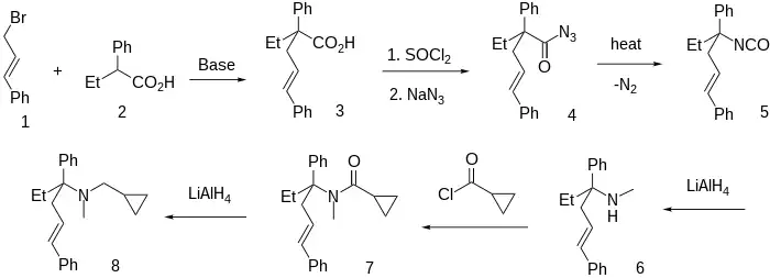 The first step involves a base catalysed alkylation between 2-phenylbutyric acid [90-27-7] (1) and cinnamyl bromide [4392-24-9] (2) giving 2-ethyl-2,5-diphenylpent-4-enoic acid, CID:53783865 (3). Stepwise treatment of the carboxylic acid with thionyl chloride and sodium azide followed by heating of this compound in an aprotic solvent causes the Curtius rearrangement of the acyl azide (4) to the isocyanate intermediate (5). The reduction of the isocyanate was carried out with lithium aluminium hydride affording the corresponding N-methylamine, i.e. N-Methyl-3,6-diphenylhex-5-en-3-amine, CID:53758312 (6). Schotten-Baumann reaction with cyclopropanoyl chloride [4023-34-1] gives the corresponding amide (7). A second step with lithium aluminium hydride reduces the amide carbonyl completing the synthesis of igmesine (8).