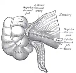 The ileocecal fold (or ileocaecal fold) is an anatomical structure of the human abdomen formed by a layer of peritoneum between the ileum and cecum. The upper border of the ileocecal fold is fixed to the ileum opposite its mesenteric attachment, and the lower border passes over the ileocecal junction to join the mesentery of the appendix (and sometimes the appendix itself as well). Behind the ileocecal fold is the inferior ileocecal fossa.[1]