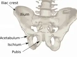 The 'English' name ilium as bone of the pelvis can be traced back to the writings of anatomists Andreas Vesalius, who coined the expression os ilium.[7] In this expression ilium can be considered as the genitive plural of the nominative singular of the noun ile.[7] Ile in classical Latin can refer to the flank of the body,[8] or to the groin,[8] or the part of the abdomen from the lowest ribs to the pubes.[8] Ile is usually encountered as plural (ilia) in classical Latin.[8] The os ilium can literally be translated as bone (Latin: os[8] ) of the flanks.